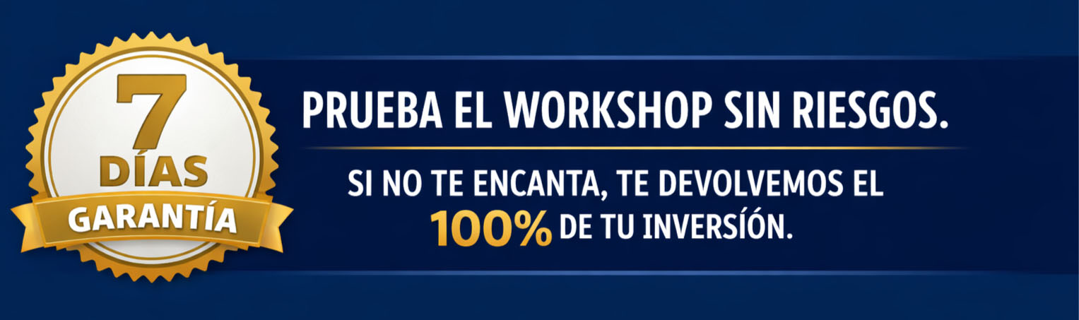 "Garantía de Satisfacción de 7 Días" Prueba el Workshop sin riesgos. Si en los primeros 7 días sientes que no es para ti, te devolvemos el 100% de tu dinero sin preguntas. ¡Toda la responsabilidad es nuestra!
